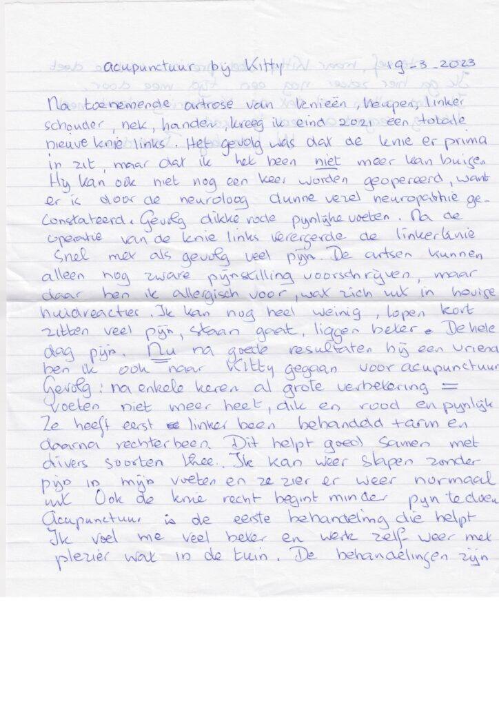 Ik kwam voor een elleboogpijn die ik al maanden had en na 1 behandeling was ik er vanaf. Sindsdien heeft Kitty mij geholpen met mijn rugpijn, mijn zwakkere nieren, droge ogen ( helemaal weg), verkoudheden en oorsuizingen. Ze heeft alle tijd voor je en is altijd vol aandacht. Ik kijk er altijd naar uit naar een behandeling want je wordt er altijd beter van.